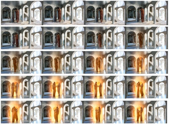 A short video of the proposed therapeutic use of virtual and/or augmented reality as an add-on metaphysical architecture element. The video, generated by the author using Hailou AI software, depicts the second option of the second level of intervention, which involves building the VR/AR scenario around a specific architectural element, the sculpted figures in the famous metaphysical building, the house of the sculptor Xavier Corberó in Barcelona. The extracted keyframes exhibit the development of the sculpted figures into a man and a woman dancing in rotation on a chess-like, black and white tiled floor (intended to boost attention and enable temporal detachment from the physical constraints of the space. (The video was generated by the author.)