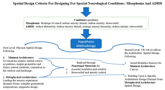 Diagram of spatial design criteria for designing spaces for the special neurological conditions: Misophonia and ADHD. Minimal and metaphysical architecture incorporating functional materials for acoustic insulation and stress relief are employed as the first level of the proposed therapeutic spatial design, and VR and AR scenarios are employed as an add-on to the architectural spatial design as the second level of intervention.