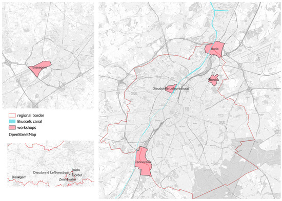 The context of the 2013–2020 project is one of ongoing brokering of collaboration between regions. Since Belgium is a federal state, the regions possess autonomy for as territorial planning. Brussels needs to cooperate with Wallonia and the Flemish Region on inter-regional projects, with no formal metropolitan collaboration structure [39]. The Zone of Economic Expansion (ZEE), designed to attract enterprises to the Brussels Canal District (which includes the five sites for the co-design workshops), is an Urban Enterprise Zone: intended to stimulate growth in de-industrialized city districts [45,46] and aims for more functional mixing in the Canal District [42]. Similarly, since 2017, a territorial development program named TOP has been implemented in the Noordrand (‘north edge’), alongside a partnership named Buda+. The Noordrand TOP is a collaboration between development agency perspective.brussels (Brussels-Capital Region), Omgeving Vlaanderen (Departement Omgeving, Flemish Region), the Province of Flemish Brabant, and OVAM (the Flemish public waste management agency). T.OP focuses on the joint development of the northern periphery of Brussels, involving areas north of the Brussels Region. Such alliances represent a novel metropolitan perspective for Brussels, Flanders and Wallonia [33] and the co-design workshops reported and discussed here were a key part of this ongoing process.