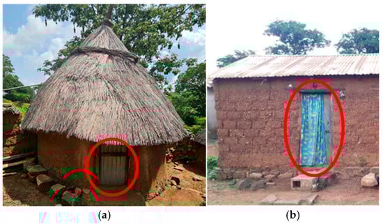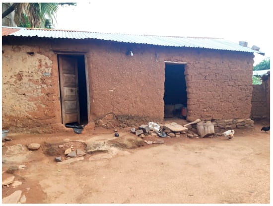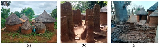 In Africa, the habitat unit is not usually a compact building concentrating several functions, but rather these activities are carried out in small units distributed around a courtyard []. The original traditional habitat of the urban agglomeration of Kara is composed of a central courtyard around which are grafted rooms intended for various functions. Figure 1 shows in (a) an overview of the original traditional Kabyè dwelling in the urban agglomeration of Kara, in (b) two (02) giant clods of earth averaging 1.5 m in height framing the house entrance and in (c) an open mini-pit averaging one meter (01 m) in depth, a sizeable space that is an integral part of the original traditional Kabyè concession located at the front of the house. The results of field surveys show that this is a space intended for keeping animals, generally goats, under the visual control and vigilance of all nearby residents, and which also serves as a place for preparing natural manure for cultivation periods.