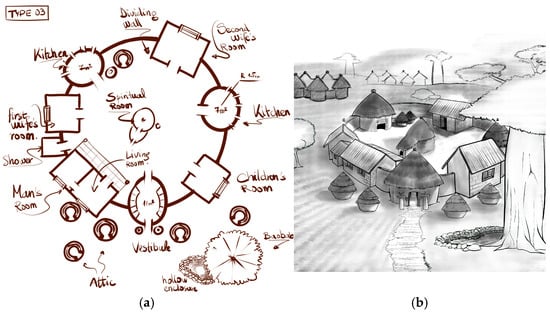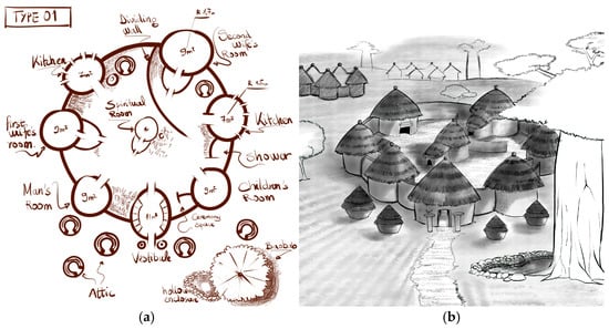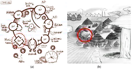 All this, organized in a spectacular and original way, testifies to the ingenuity of the Kabyè builders in the design and implementation of their traditional structures. Figure 2 shows in (a) a two-dimensional view (2d) and in (b) a three-dimensional view (3d) of the original traditional dwelling in the urban agglomeration of Kara, with the rooms arranged around the courtyard. This is composed of a vestibule, rooms for sleeping, kitchens, attics, a shower, a room for deities and chicken coops, all arranged in a circular fashion to form a courtyard in the middle of the house. The Kabyè house has no particular orientation. As shown in Figure 2, the vestibule is positioned to facilitate the entry and exit of the inhabitants. It determines the position of the other rooms.