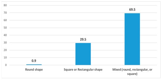 These original dwellings, with their round rooms, are disappearing and being replaced by rectangular or square shapes. Figure 3 shows that 69.5% of respondents live in mixed rooms, i.e., round, rectangular or square, 29.5% in rectangular or square rooms and 0.9% in round rooms. This result shows the extent to which the original round shape has disappeared and been replaced by new shapes such as the square and the rectangle. This mutation is the result of changing lifestyles, galloping urbanization, the growing disinterest of young people and those involved in the construction of traditional buildings, the emergence of new needs and global warming. From [], the major destruction of buildings and historic sites are among the risks to humanity associated with climate change.