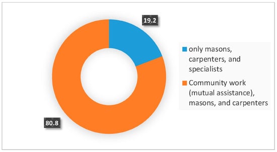 The construction of any human dwelling mobilizes a number of actors according to their skills and knowledge. In the urban agglomeration of Kara, the original traditional habitat is no exception to this rule. In fact, the buildings are built by the entire community through mutual aid, bringing together people of all profiles. Figure 5 shows that the original traditional dwellings in the urban agglomeration of Kara are built by the entire community, assisted by masons and carpenters in a mutual aid scheme. This construction process was confirmed by 80.8% of respondents. The house is built by craftsmen and assisted by the beneficiaries of the work. All the work is done by hand. From [], in traditional African society, there are no specialists for construction. Everyone works for themselves, following virtually unchanging techniques handed down from generation to generation. In this traditional construction, as among the Batammariba, the labor force and time are not binding parameters, yet today they have become very significant. As far as categories of people are concerned, there are no exceptions. All categories, i.e., men, women and children, assist and contribute to the implementation of the work. In addition to the latter, the elderly, deities and ancestors have their share of participation, which is not necessarily physical. Each category plays a specific role. From [], in the construction of traditional African rural dwellings, everyone has a role to play. The man has the essential part; the woman plasters and decorates, and the young people are responsible for transport, especially water by the young girls. The whole chain of work illustrates the solidarity and sociability of the construction industry in the Kabyè region.
