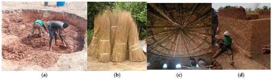 All houses are built using specific techniques and materials. In the urban agglomeration of Kara, traditional Kabyè houses are built using purely traditional techniques and local materials: raw earth, straw and raw wood. Figure 6 shows in (a) earth dug near a building site to a depth of 80 cm to around one meter (01 m), in (b) straw to cover the houses, in (c) wood for the framework and in (d) the successive laying of rammed earth clods. All these show the local materials (earth, straw, and wood) used to build traditional houses and the techniques employed. Indeed, this kneaded earth technique remains the construction technique par excellence. The dug earth is kneaded by hand and feet, successively mixed with water, then shaped into earthen balls and laid in successive layers. Wood and straw are used for roofing and the roof frame.