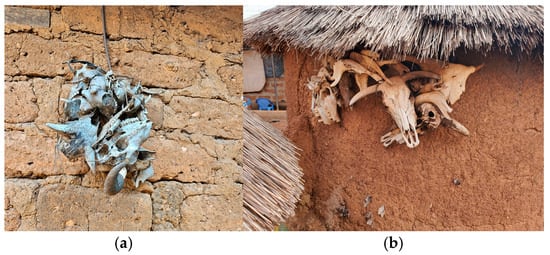The Kabyè decorate their homes with hunting and war trophies, namely the horns of wild beasts and weapons taken from the enemy. Figure 8 shows in (a) and in (b) the remains and horns of animals on the facades of a house, as decoration and spiritual protection against evil spirits. Kabyè house facades are generally very simple. Overhanging roofs protect the walls from the elements and shade the facades. However, with migration, outside influences, the emergence of new needs, the arrival of new shapes such as rectangular and square and the evolution of building materials, the original traditional habitat of the urban agglomeration of Kara has evolved to give rise to two (02) additional types of traditional habitat, in addition to the original, within this geographical area.