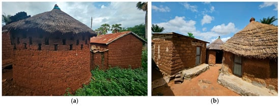 Traditional architecture is a testimony to the diversity of cultures and lifestyles, passed down from generation to generation and specific to a given community or country []. In Africa, it is characterized by local materials such as earth, stone, wood and straw, and is essentially shaped by a number of environmental, ecological, sociological, demographic, geographic, religious and climate-related factors []. It is also shaped by natural conditions, notably the climate, vegetation and soil [], and by the absence of construction specialists, each one working for himself according to virtually unchanging techniques handed down from generation to generation []. Each actor plays a specific role in the construction process. From [], the man plays the essential part, the woman plasters and decorates, and the young people are responsible for transport, especially water by the young girls. Indeed, ancient African societies are known for the exceptional character of certain significant elements of their architectural and landscape heritage. Within this African architectural heritage, stone and earthen constructions play an important role. Earthen architecture is represented by monumental buildings and constructions of quality that have stood the test of time. The earthen mosques of Mali (Djenné, Tombouctou, and Gao) and the Toloy granaries (2nd–3rd century) have nothing to envy of medieval European cathedrals or some emblematic Asian constructions of the same period such as Machu Picchu and the Taj Mahal []. The high representation of earthen buildings on the United Nations Educational, Scientific and Cultural Organization (UNESCO) World Heritage List, estimated at around 17% of archaeological and architectural historic sites, representing 120 listed ensembles, although hundreds more deserve to be listed [], testifies to the authenticity and originality of the ancestral skills of earthen architecture.