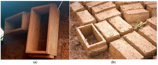 Described as an indirect construction method, the earth is molded into wooden frames for masonry. Figure 12 shows in (a) a wooden mold and in (b) a mold and mud bricks, also known as molded bricks or adobes. The transition from kneaded clay to molded brick is probably the result of an interior influence, especially between northern and southern Togo, and external influences from neighboring countries (Benin and Ghana). More suited to rectangular shapes, molded bricks or mud bricks appeared in the urban agglomeration of Kara at the same time as the rectangular form. Raw earth brick or adobe is a mixture of clay, water and sometimes plant matter such as chopped straw to increase its strength. From [], the mixing of straw and clay is due to the complementary nature of these two materials. Adobe is therefore a building material made from a mixture of sand, clay and a quantity of chopped straw or other plant fiber. Each element in the mix plays its part. The sand reduces the likelihood of micro-cracks in the earth block, the clay binds the particles together and the chopped straw gives a certain degree of flexibility [].
