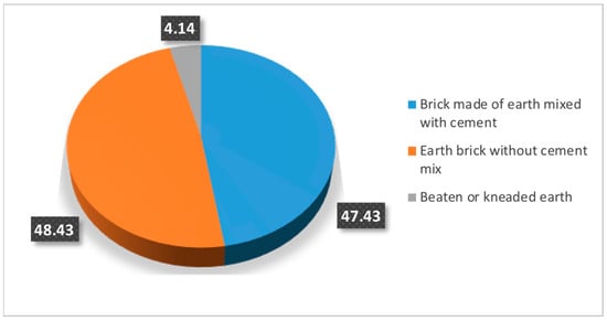 In the urban agglomeration of Kara, mud bricks are widely used. Figure 13 shows, according to the results of field surveys, that 48.43% of buildings are made of uncemented mud bricks, compared with 47.43% made of mixed materials and 4.14% made of kneaded earth. These data illustrate an increasing shift away from the use of kneaded earth, which symbolizes the originality of wall construction, towards more advanced materials, notably mud bricks and cement mixes. From [], knowledge of brick manufacture often preceded the adoption of the rectangular plan. This assertion does not seem to have been verified by the Kabyè when we see that rectangular houses were built using the rammed earth construction technique long before rectangular houses were built using the mud brick technique.