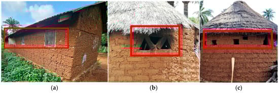 The change in door dimensions can also be seen in the windows, which have gone from dormitory rooms with no windows and kitchen rooms with small triangular or square openings to large rectangular or square openings averaging 80 cm wide by 1 m high, with wooden fastenings for sleeping rooms. Figure 16 shows in (a) the windows of a rectangular room that are larger than the window openings of the original kitchen rooms, in (b) and in (c), marking the evolution in traditional building styles in the urban agglomeration of Kara. All these photos, data and comparisons illustrate the first evolution of the original traditional house of the urban agglomeration of Kara, marking the dynamics observed.