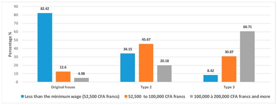 In every society and for thousands of years, access to an evolution has always been reserved for a social category of people, commonly called ‘cadres’, who have a higher income than the average farmer. Figure 18 shows that, firstly, among the occupants of the original habitat, 82.42% of the respondents have a monthly income below the minimum wage (XOF 52,500), while 12.6% and 4.98% of the respondents have a monthly income above the minimum wage. Among type 2 residents, 34.15% and 45.67% have a monthly income below the minimum wage and between XOF 52,500 and 100,000, respectively. Finally, among type 3 residents, 60.71% have a monthly income between XOF 100,000 and 200,000 or more. High monthly incomes facilitate the purchase of modern building materials, which farmers are unable to afford. This would be the reason which explains the low proportion of occupants in the third type. From [], earth building materials are generally less expensive.