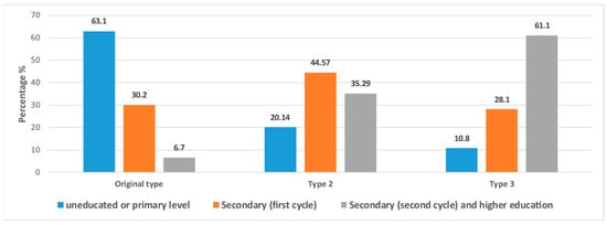 In addition to a high monthly income, occupants of this advanced type have a certain level of education. Figure 19 shows that, according to the field results, 63.1% of the occupants of the original houses have no education or a primary-level education, 44.57% of the occupants of type 2 houses have a lower secondary education and 61.1% of the occupants of type 3 houses have upper secondary education. These data illustrate a strong presence and proportion of the less educated people in the original traditional buildings, while the more educated dominate in the more advanced traditional buildings. This can be explained by the desire and willingness of the educated persons to change and bring something new or modern to the design and construction of their homes. Indeed, the latter, because of their high level of education, are more likely to find a decent job and earn enough money to afford modern building materials. This is not the case for the less educated people, who for lack of education are mostly farmers and craftsmen.