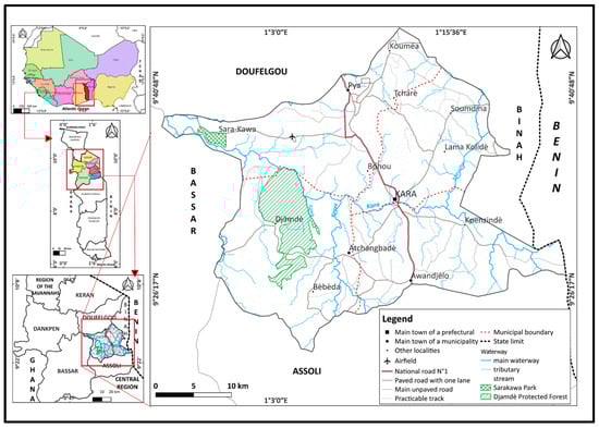 The study area, the urban agglomeration of Kara, is located in Togo, West Africa. It is situated in the northern region of the country. It lies between 9°30′ and 9°45′ north latitude and 1° and 1°15′ east longitude, with an average surface area of 1075 km2, and is mainly populated by the Kabyè (people who consider themselves indigenous to the place). Other ethnic groups such as the Tem, Lamba, Nawdéba, etc., and foreigners are also found in the locality. It is bordered to the north by the Doufelgou prefecture, to the south by the Assoli prefecture, to the east by the Binah prefecture and the Republic of Benin, and to the west by the Bassar and Dankpen prefectures. Administratively, with an estimated population of 283,738, the prefecture of Kozah is made up of one hundred and ten (110) villages grouped into fifteen (15) cantons (INSEED 2022) and structured into four (04) communes, namely the commune of Kozah 1 with Kara as its administrative center, the commune of Kozah 2 with Pya as its administrative center, the commune of Kozah 3 with Awandjélo as its administrative center, and the commune of Kozah 4 with Atchangbadé as its administrative center. The town of Kara is the capital of the Kara region, the capital of the Kozah prefecture and the capital of the Kozah 1 commune. In the context of our study, the urban agglomeration of Kara is made up of the town center, which is the commune of Kozah 1, and the outskirts, which are the communes of Kozah 2, Kozah 3 and Kozah 4. It can therefore be assimilated into the Kozah prefecture, as shown on Scheme 1. The human occupation of the Kabyè, the majority and presumed indigenous people of the study area, is the consequence of a long-standing settlement process. This ancient process can be understood through two diametrically opposed interpretations. The first stems from the descent of the first Kabyè man from the sky, while the second locates the origin of the people in migratory phenomena.