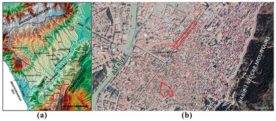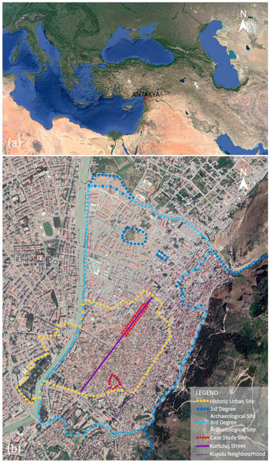 Antakya is a multi-layered historic settlement accommodating the heritage of different civilizations, including Hellenistic, Roman, Seljuk, Crusader, Mamluk, Ottoman, French, and the Turkish Republic. It experienced catastrophic earthquakes throughout history as well. As for the geographical characteristics, Antakya is surrounded by Mount Amanos (Nur Mountains) to the north, Mount Kel to the south, Mount Habib Neccar to the east, and the Amik Plain to the northeast, with the Eastern Mediterranean Sea lying to the southwest of the city [32]. The case study sites of Kurtuluş Street and Kuyulu Neighborhood are located between the Asi River passing by the city and Habib-i Neccar Mountains (Figure 4). Antakya has similar qualities to heritage cities from nearby areas of Palestine, Tunisia, Morocco, with its organic settlement patterns created through dead-ends and introverted courtyard-houses. Its Greco-Roman grid plan, on the other hand, is reminiscent of Hellenistic and Roman cities such as Naples, Rome, L’Aquila, Athens, etc. The uniqueness of Antakya is the combined city layout, turning from a Hippodamian grid towards an organic morphology, which is similar to İstanbul in that aspect. Kurtuluş Street is the main component of the grid plan, while Kuyulu Neighborhood is representative of the organic morphology.