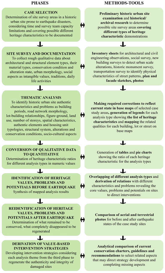 The methodology of this study comprises seven main phases: selection of the case study; site survey and documentation; determination of analysis themes and mapping; conversion of qualitative data in the analytical maps into quantitative data; synthesis of data for evaluation of heritage values, preservation problems, and potentials before earthquake; examination of aerial photos to redefine values, problems, and potentials after earthquake; and developing intervention strategies for re-establishing authenticity and integrity.