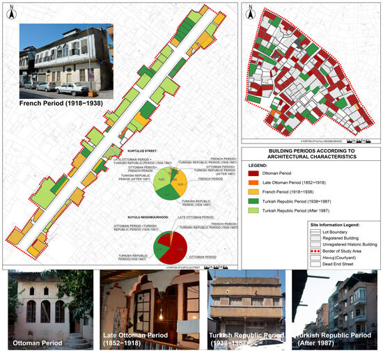 The buildings in Kuyulu Neighborhood and Kurtuluş Street are classified into five categories based on construction periods: the Ottoman Period, Late Ottoman Period (1852–1918), French Period (1918–1938), Turkish Republic Period (1938–1987), and Turkish Republic Period (after 1987). The 1852 earthquake in Antakya marks the beginning of the Late Ottoman Period, with buildings from this era presumed to have been erected subsequently. The Late Ottoman influence persisted until 1918, after which French-style architecture emerged during the French occupation (1918–1938). From 1938 onward, Early Republican Period buildings were introduced. Following 1987, changes in building permits led to the construction of riser buildings exceeding three stories. On Kurtuluş Street, 37% of the buildings date from the Turkish Republic Period (after 1987) and 31% from the French Period (1918–1938), with the Turkish Republic Period (1938–1987) representing the third most common style. Additionally, several hybrid designs exist, displaying designs from different periods, such as Late Ottoman ground floors with Turkish Republic upper floors, or combinations of the Ottoman and French Periods. In Kuyulu Neighborhood, 58% of buildings were built in the Ottoman Period. The other most common periods were the Turkish Republic Period (1938–1987) and the combined designs of the Ottoman Period and Turkish Republic Period (1938–1987). Single examples of the Late Ottoman and the combined design of the French Period and Turkish Republic Period (1938–1987) were present as well. In the mapping, five periods are represented by five different colors; the buildings that display the two different periods’ characteristics on different floors are colored in two colors, representing related periods (Figure 5).