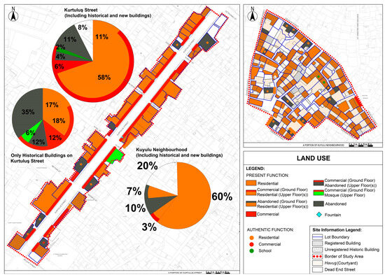 Kurtuluş Street accommodated mixed functions, such as commercial ground floor, residential upper floor (58%); commercial ground floor, abandoned upper floor (4%); and commercial ground floor, mosque on the upper floor of one building (2%). Furthermore, totally abandoned (11%) and commercial (6%) land use existed. A few instances of land use could not be observed (8%). In turn, the commercial–residential combination was the most common, representing the authentic state. However, when only historic buildings were considered, 35% were totally abandoned, while 12% were abandoned on the upper floor.