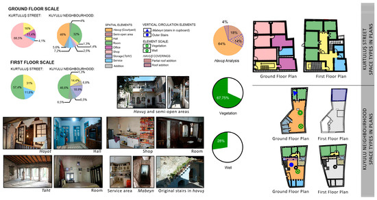 On Kurtuluş Street, the typical scheme of ground floors was a series of shops (68.5%) and a linear hall (16%) leading to the upper floors. Offices and service spaces were rare: 11.4% and 4.1%, respectively. In Kuyulu Neighborhood, authentic courtyards (havuş, 64%) were the datum element on the ground level. Although indigenous vegetation was often preserved (67.7%), the authentic wells (28%) and haymas, semi-open spaces spanned with ivies (4%), were less preserved and were rarely observed. Small metal canopies (18%) and roofs as wide as the courtyard (14%) were occasionally added. Rooms flanked the courtyards or were positioned on upper floors (32%). A single shop was seen. In both sites, residential spaces were the most common on upper levels. The first floors of Kurtuluş Street included rooms (57.6%), halls (31%), and service spaces (11.6%). In Kuyulu Neighborhood, halls were seen on half of the first floors (46.6%). Halls and storage spaces were seldom present: 14.4% and 18.9%, respectively. Services were hardly ever present (5.5%). Authentic spatial elements such as a sleeping space reached by a flight of wooden stairs hidden in the cupboard (taht/tahtlık) were also seen on some houses’ first floors. A semi-open living space extending to the courtyard (hayat) was recorded in a few houses as well (Figure 11).