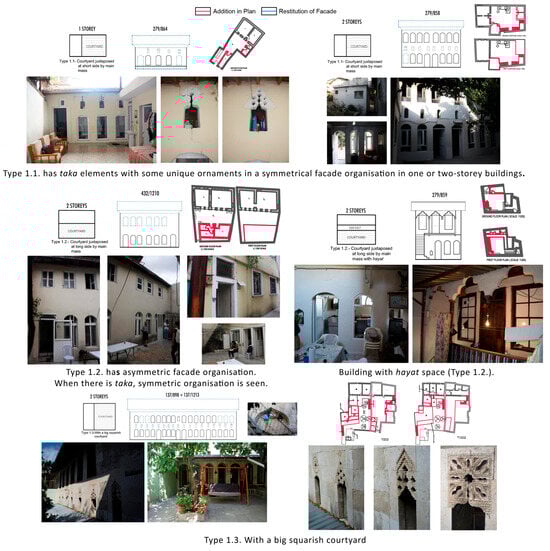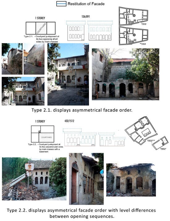 - The first typology was “courtyard juxtaposed at one side by main mass,” which included one- or two-story buildings, and just three of them had traces of a taka above the ground-floor windows. Its subheadings are mainly “1.1. Courtyard juxtaposed at short side by main mass,” “1.2. Courtyard juxtaposed at long side by main mass,” and “1.3. With a big squarish courtyard,” as shown in Figure 13. As a rare example of the “courtyard juxtaposed at long side by main mass” type, two examples were seen with a hayat space on the first floor. On the first floor, openings had cinquefoil arches, and they faced the hayat space, while on the ground floor, either segmental arched or rectangular openings existed. The facades had asymmetrical organization. The only example belonging to the “with a big squarish courtyard” typology had a garden wall addition separating the courtyard in the middle. Therefore, the façade of the building, which was used as a French school for a period, was also divided into two. The façade organization was symmetrical, and the ground-floor openings had ornamented taka designs above them, which differentiated the building and made it a rare example for the site.