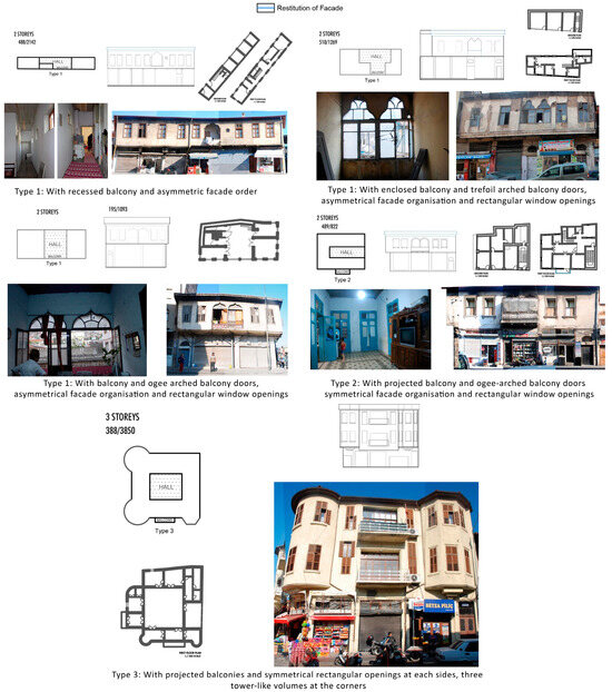 The main parameters considered while determining house types were the main circulation element (courtyard or hall) and the positioning of building masses or rooms around them. For the sub-types, in Kuyulu Neighborhood, the symmetry/asymmetry of building façade openings, the existence of a hayat space, the presence of a taka, and the number of stories were sub-parameters, while on Kurtuluş Street, the symmetry/asymmetry of building façade openings and the design of the balcony door in harmony with the hall constituted the sub-parameters.