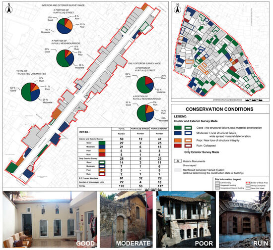 In the fifth phase, an evaluation was conducted by overlapping thematic maps. The overlapping strategy was searching for relationships between data sets, e.g., overlapping land use and conservation conditions revealed that abandonment results in poor conservation conditions. In turn, the heritage values and preservation problems were evaluated at lot, building, and street scales, considering physical and socio-cultural aspects. Potentials were also pointed out, e.g., abandoned buildings have the potential for adaptive reuse as socio-cultural and education facilities, which were limited in the sites.