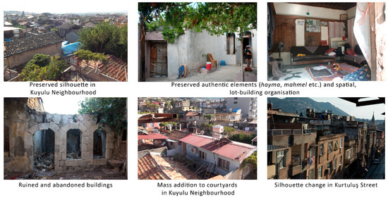 On the other hand, the high number of buildings in ruin, poor, or moderate conservation conditions threatened the sustainability of both sites. The lack of maintenance or abandonment were the basic causes of structural integrity loss. Alterations such as mass additions, the closing of courtyards with metal roofs, story additions, and architectural element changes diminished the authenticity of the CH sites. On Kurtuluş Street, integrity was partially lost with the alteration of the silhouette. Heavy traffic on Kurtuluş Street was a threat to the authentic spirit of place as well as the structural integrity of the CH buildings. The tendency to leave the neighborhoods for better comfort conditions in Kuyulu and Syrian immigrants preferring the houses on Kurtuluş Street for rent hindered the continuity of the local way of life. Nevertheless, the abandoned buildings have adaptive reuse potential, e.g., socio-cultural hubs; local health centers, education and training facilities, especially for women; houses for marketing household products to the locals, and hostels for youth and cultural tourists. The existence of conserved authentic buildings creates a reference for alteration recovery plans in the changed authentic buildings (Figure 19).