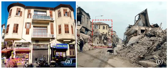 The only surviving French Period building in the examined portion of Kurtuluş Street before (a) and after the earthquake framed in red dashed line (b) (source: IZTECH 2019 [33] (a), revised from [38] 2023 (b)).