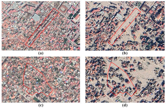 State of Kurtuluş Street before (a) and after the earthquake (b), and of Kuyulu Neighborhood before (c) and after the earthquake (d) (source: revised from [32,39].).