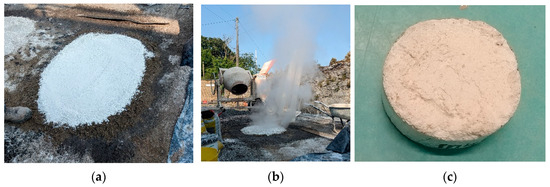 Preparation of quicklime samples: (a) layers of quicklime and sand aggregate, (b) release of steam during exothermic reaction, and (c) cylindrical samples.