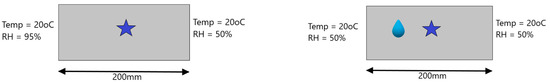 Simulation 1 focuses on vapour transfer, with water vapour moving from a high relative humidity (RH) environment (95%) on the left-hand side (LHS) to a lower RH environment (50%) on the right-hand side (RHS). The results for water content and RH are investigated at the centre of the sample, marked at 100 mm with a star in Figure 3. Simulation 2 examines liquid water transfer under conditions of a constant RH on both sides. Liquid water is introduced at 50 mm from the external side (left-hand side) by way of a user-defined constant monthly moisture load of 10,000 g/m2, applied intermittently for one month at a time in alternating months, to simulate wetting and drying cycles in the WUFI model. This is a high moisture load and was selected to investigated moisture conditions that would result in a high RH (~75–95%) in the material, which is a RH value commonly seen in buildings at risk of material decay.