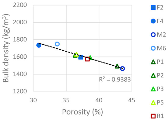 The relationship between open porosity and bulk density for the samples (Figure 4) follows an expected linear pattern due to employing the shared measurement method (R2 = 0.94). The fabricated mortars (F2, F4) are closely aligned to the linear relationship between increasing porosity and decreasing bulk density. F2 (1:2 binder/aggregate ratio) is positioned in the mid-range of the samples tested, while F4 (1:4 binder/aggregate ratio) has lower porosity. This contradicts the findings of Margalha et al. 2011, who found that compositions with a lower binder content produce mortars with greater open porosity [12]. This highlights the likely impact of other variables on binder performance, such as aggregate grading, water content, etc.