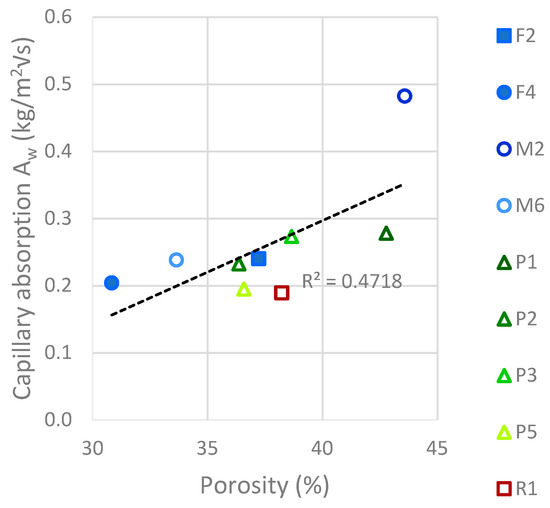 Capillary absorption was evaluated by plotting the water absorption coefficient (Aw) against total porosity (%) for all material samples, as shown in Figure 6. A weak correlation was observed (R2 = 0.47), indicating that while porosity influences capillary uptake, it does not fully explain the variability, again highlighting the importance of pore structure and connectivity.