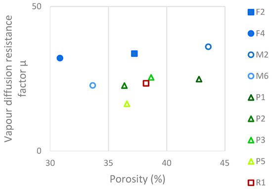 Vapour diffusion resistance (μ) was plotted against total porosity (%) for all material samples as shown in Figure 7. No relationship was observed between open porosity and vapour diffusion resistance, while analyses of brick and stone materials have shown an increase in vapour permeability at higher open porosity [20,21]. The lack of correlation observed here aligns with Arrizzi and Cultrone (2014), who also found that vapour diffusion in their mortar samples was not influenced by porosity or aggregate content [22]. The fabricated mortars (F2 and F4) exhibited vapour diffusion resistance values toward the higher end of the range compared with their historic counterparts, with only M2 showing higher values. Increased vapour diffusion resistance is undesirable for lime-based materials, as it indicates a restriction in vapour movement through the material. However, the results are relatively closely grouped, suggesting that the slightly elevated vapour resistance of the fabricated mortars are unlikely to significantly affect moisture content in wall constructions. Additionally, differences in measurement methods, using thicker and fully intact fabricated mortars compared with irregular historic samples, may have contributed to the variation in the values observed.