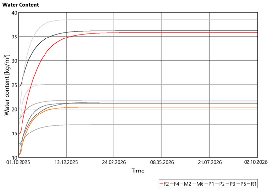 Simulation 1—water content, with fabricated mortar highlighted (F2, red; F4, orange) and historic mortars, plasters, and renders in grey, collectively illustrating the performance spectrum of the historic dataset.