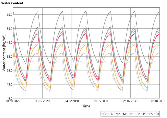 Simulation 2—Water content, with fabricated mortars highlighted (F2, red; F4, orange) and historic mortars, plasters, and renders in grey, collectively illustrating the performance spectrum of the historic dataset.