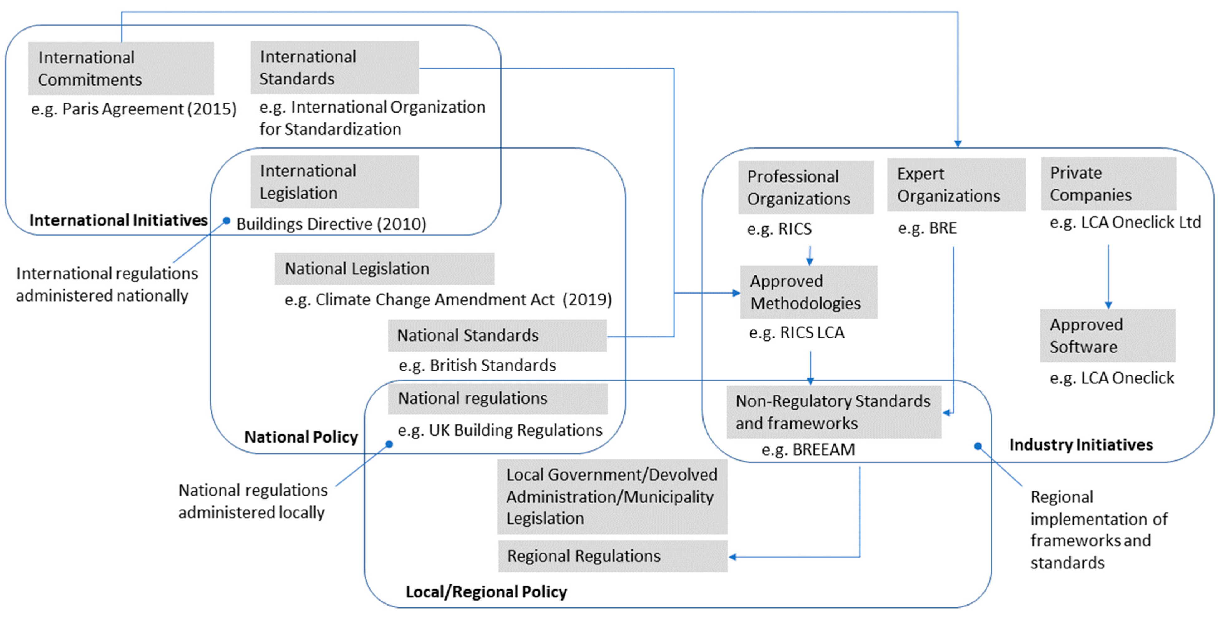 - Because non-regulatory standards are developed by private institutions, their implementation is discretionary rather mandatory. This is significant because mandatory national regulations (see Figure 4 below) typically establish minimum standards for a country. An example of legislative standards is the building regulations in the UK [33], which has specific requirements for operational energy reduction in buildings defined in the Approved Document Part L (conservation of fuel and power) [33].