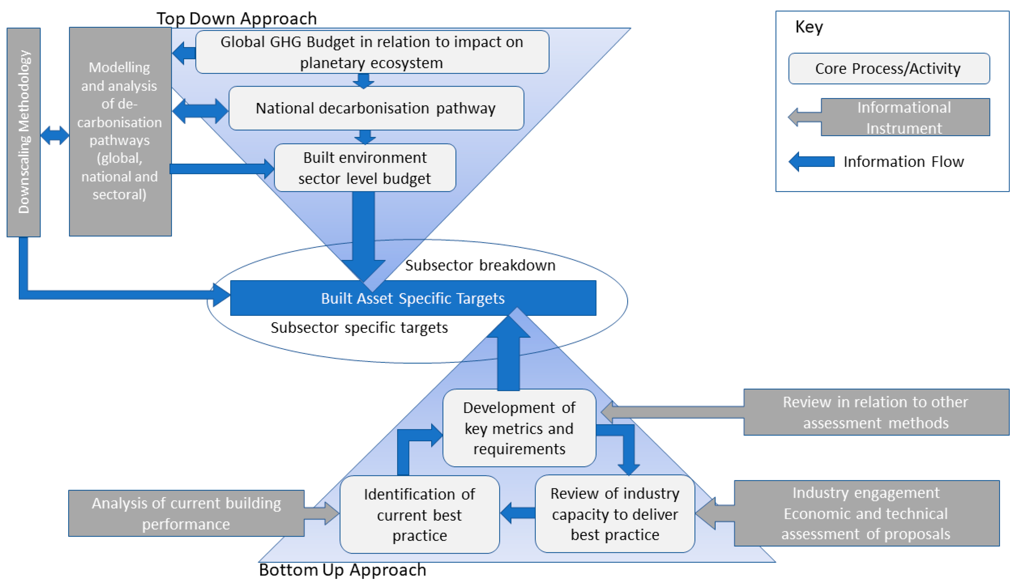 - Improved transparency in how the benchmarks and targets are derived, reconciling the bottom-up (best-practice building performance) approach with the top-down (GHG-based budget) approach (see Figure 6);