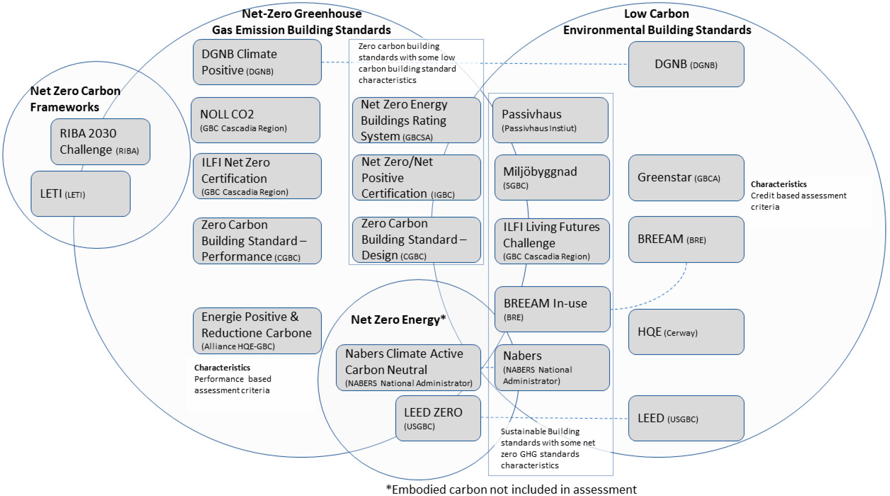 - A key feature of NZGHGEBSs is that compliance should be based on post-occupancy or as-built performance, rather than on design or predicted performance. This is a significant departure from most EBSs, and it can be postulated, based on critiques in the literature, that this is a response to the problem of the performance gap. While most NZGHGEBSs require post occupancy evaluation of performance to ensure compliance, the assessment period varies considerably. The point at which an asset can be considered a net-zero GHG emission building can be one year after practical completion, as is the case with ILFI Zero Carbon Certification, to five years for Noll CO2, to ongoing on an annual basis until the end of a building’s life, as is the case with LEED ZERO. This variance highlights some discord around the temporal boundaries of net-zero GHG emission definitions but is also a reflection of the practicalities of applying a standard.
