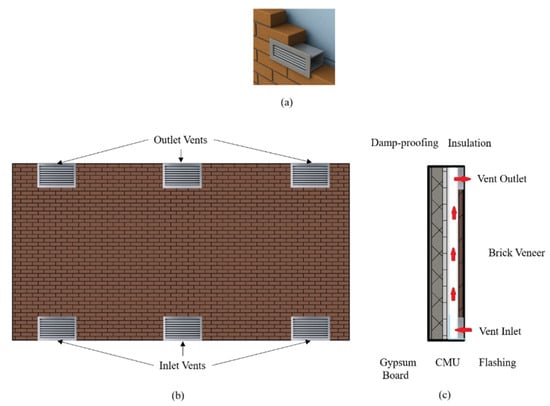In response to these challenges, ventilated wall systems have gained increasing attention as a passive strategy to improve thermal performance [4,5] illustrates the configuration of an example of VCW. A naturally ventilated cavity wall is an enhanced version of the conventional wall where inlet and outlet openings are installed on the external veneer to facilitate buoyancy-induced or wind-driven air flow in the wall cavity [11,12]. In this context, the ventilation airflow enhances convection currents between the wall surfaces and the ambient air, thus reducing solar heat in cooling seasons [2,3]. The vents may be closed during the heating periods to prevent energy loss [2]. This allows VCWs to be a versatile retrofitting solution for existing cavity walls [13].