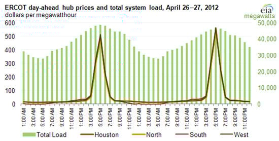 - U.S. Energy Information Administration (EIA). Wholesale Electricity Prices Spike in Texas; U.S. Energy Information Administration (EIA). 2012. Available online: https://www.eia.gov/todayinenergy/detail.php?id=6070 (accessed on 29 October 2025).
