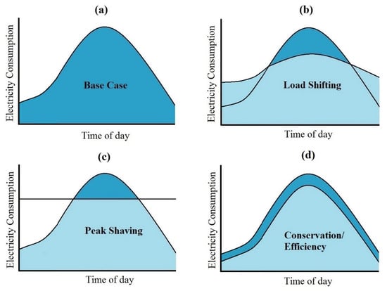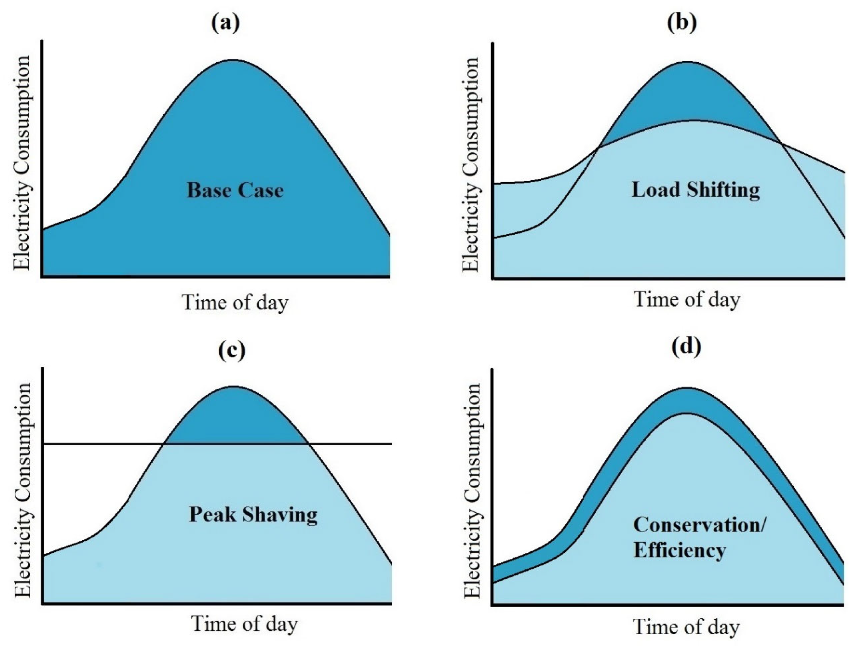 Conceptual illustration of daily electricity consumption under four load-management strategies: (a) base case, (b) load shifting, (c) peak shaving, (d) conservation/efficiency. Reproduced from [38]. Dark blue represents the baseline electricity demand profile, while light blue represents the modified demand profile under each demand-side management strategy.