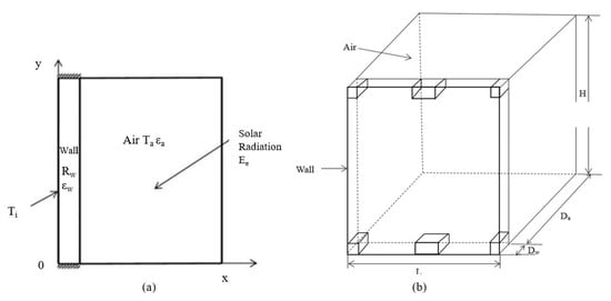 To simplify the model and isolate regional solar effects, ground radiation was neglected by omitting ground material assignment. Wall thermal resistance and boundary temperatures were specified according to the parameters summarized in Table 1. Solar irradiance varied diurnally and by location based on solar geometry, with latitude (φ) and longitude (λ) defining site-specific sun paths. A clear-sky condition was assumed, and surface and air emissivities were prescribed to determine radiative heat exchange.
