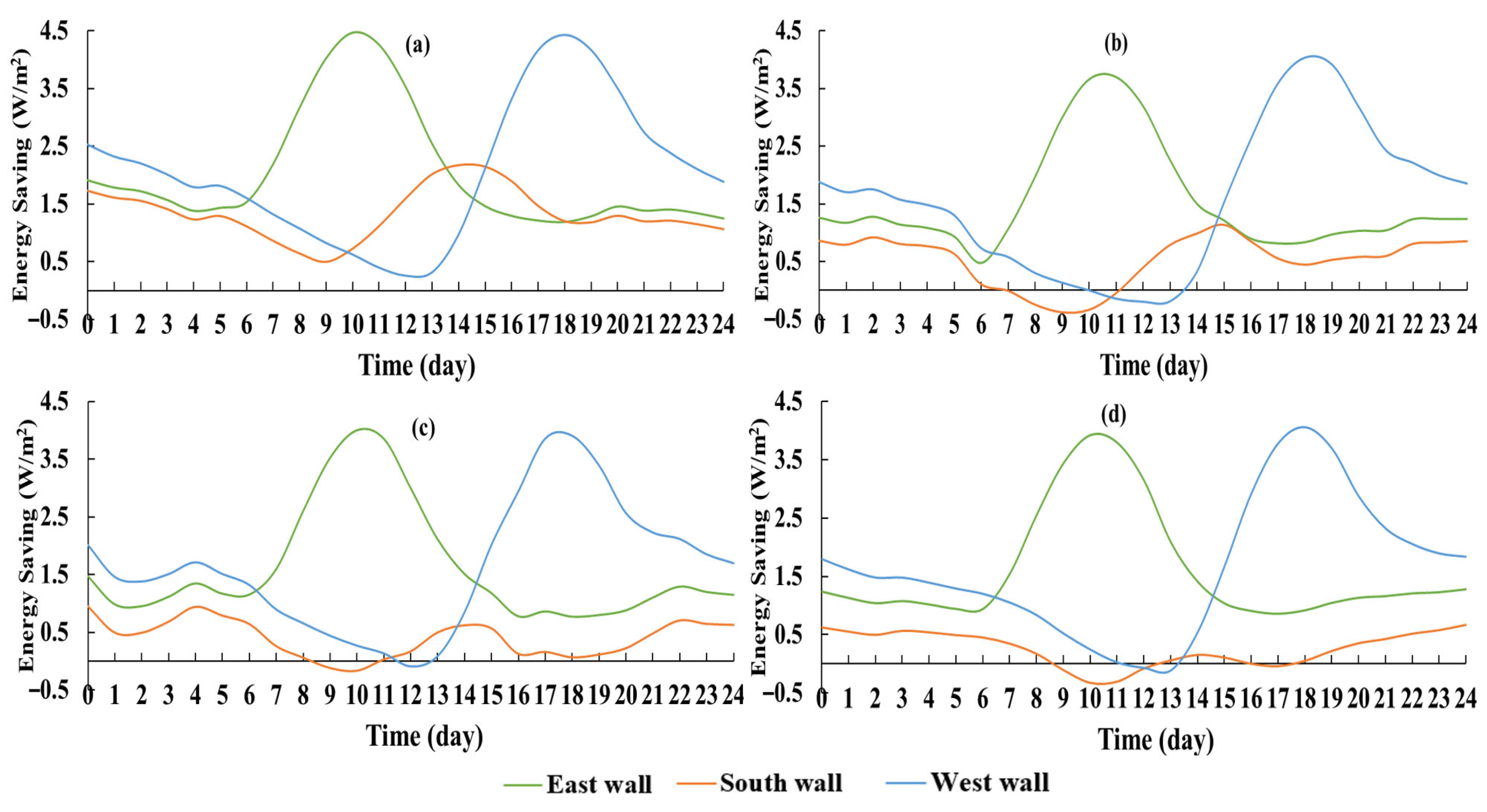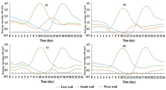 Diurnal energy saving PS for typical summer days in four U.S. cities: (a) Lincoln, 12 July 2016, (b) Las Vegas, 4 July 2016, (c) Tucson, 6 July 2016, and (d) Austin, 7 July 2016. Each plot compares the VCW vs. NVCW’s saving potential for east-, south-, and west-facing façades Diurnal energy saving.