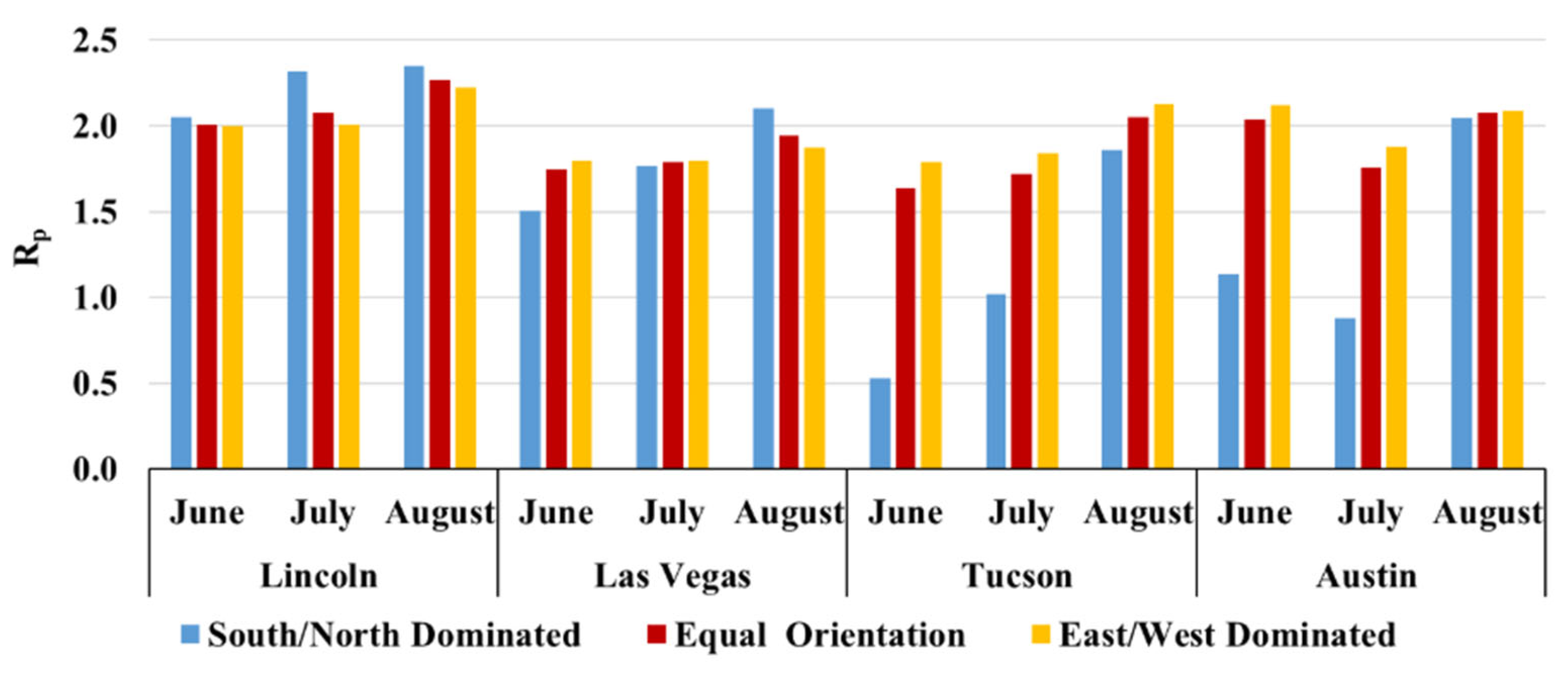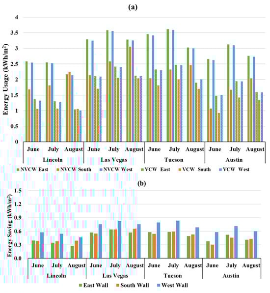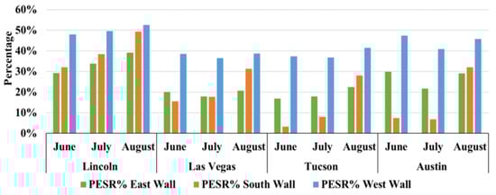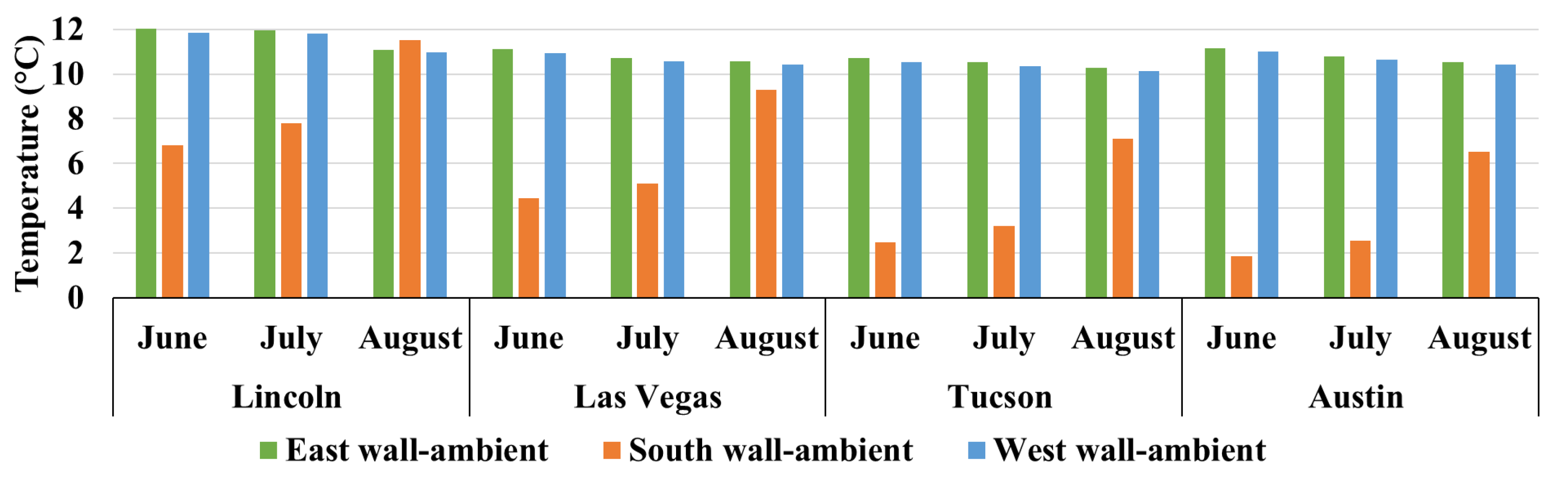 In both the current and previous studies [2], the north façade was excluded because negligible solar exposure produces almost no temperature differential (ΔTe–a), and therefore, no meaningful cooling load reduction. Similar simplifications have been adopted in ventilated façade and passive wall-cooling studies (e.g., [52,53]), in which cases solar-exposed orientations define façade cooling loads.