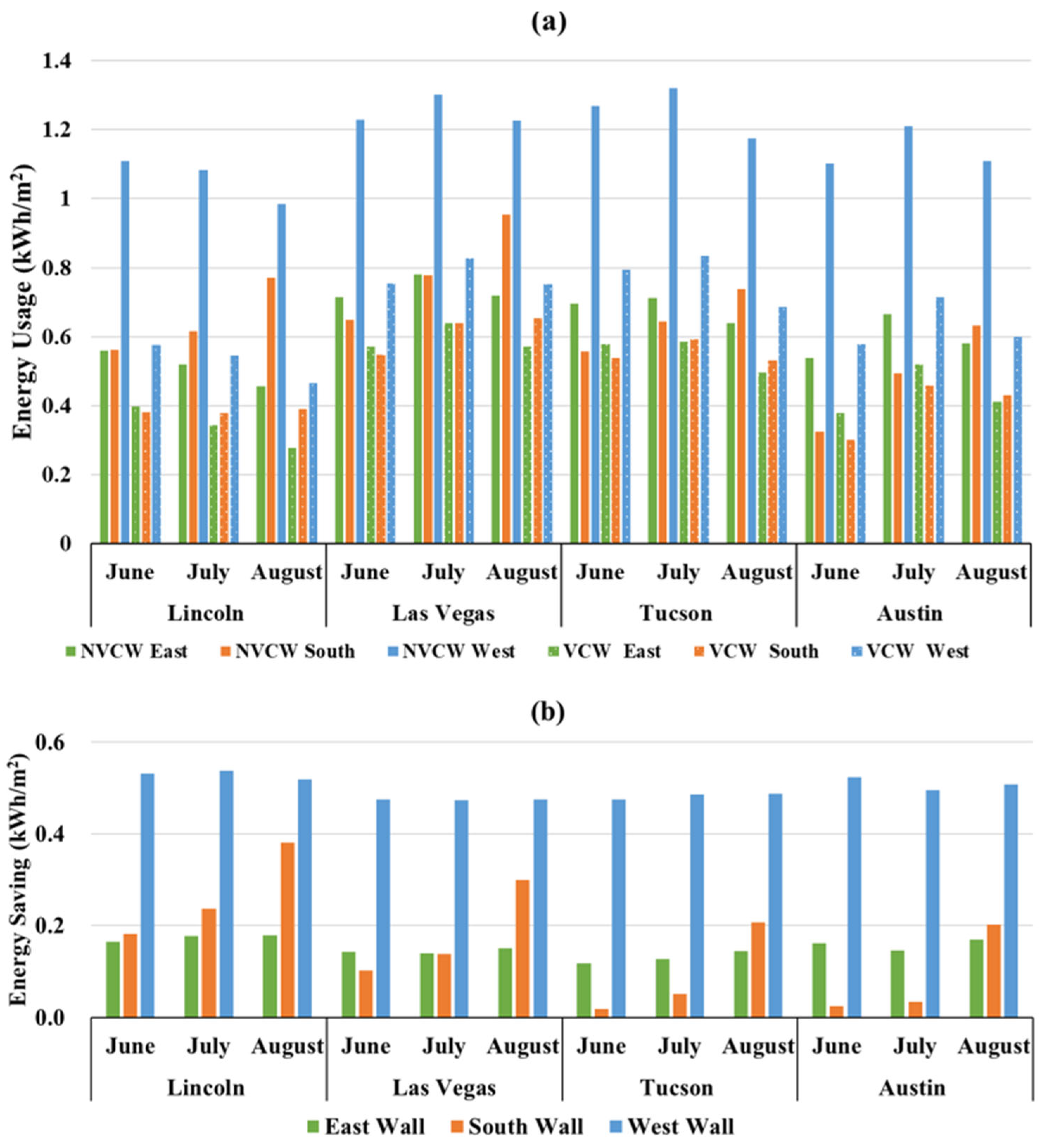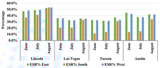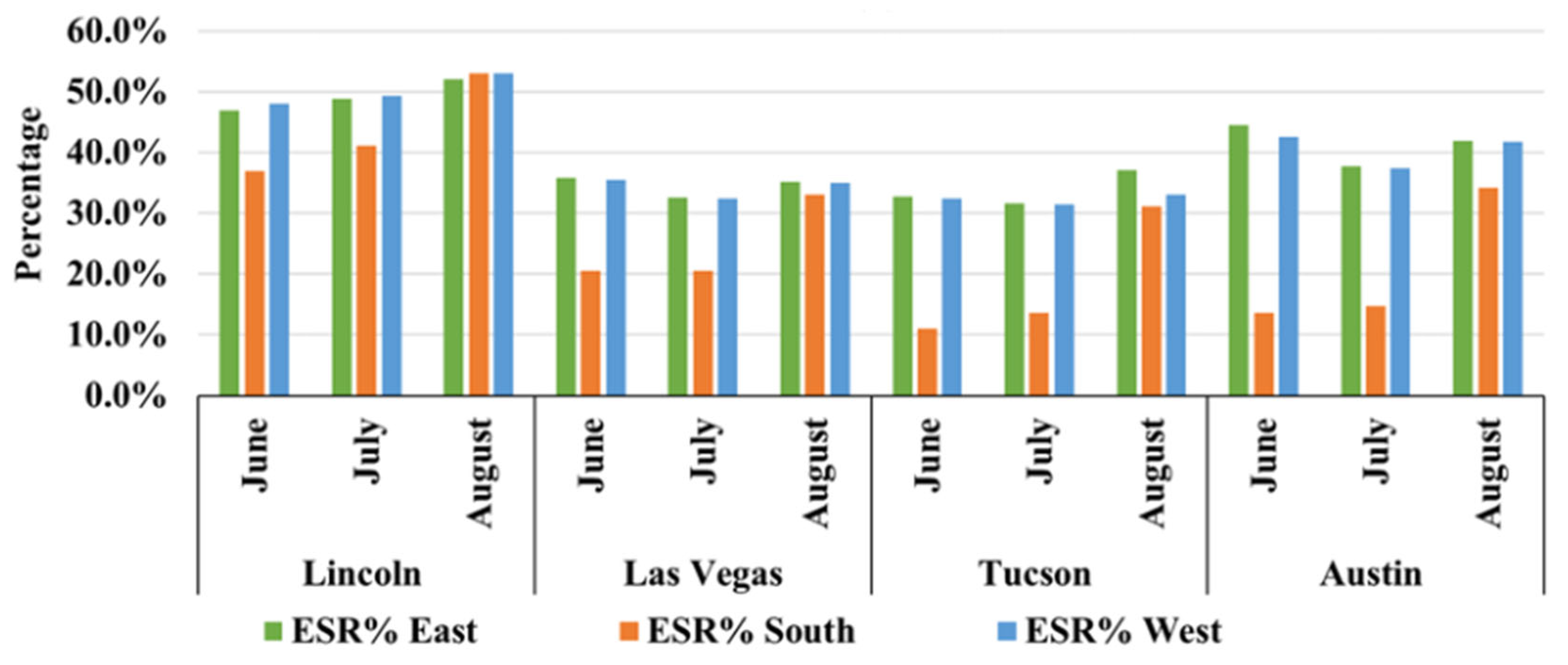 where is the percentage energy saving in one month. Calculations were performed separately for east-, south-, and west-facing façades under the representative summer months (June, July, and August) for each study location.