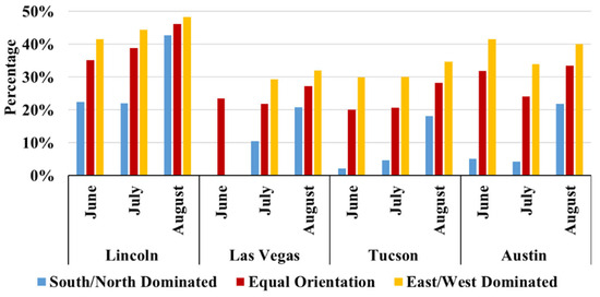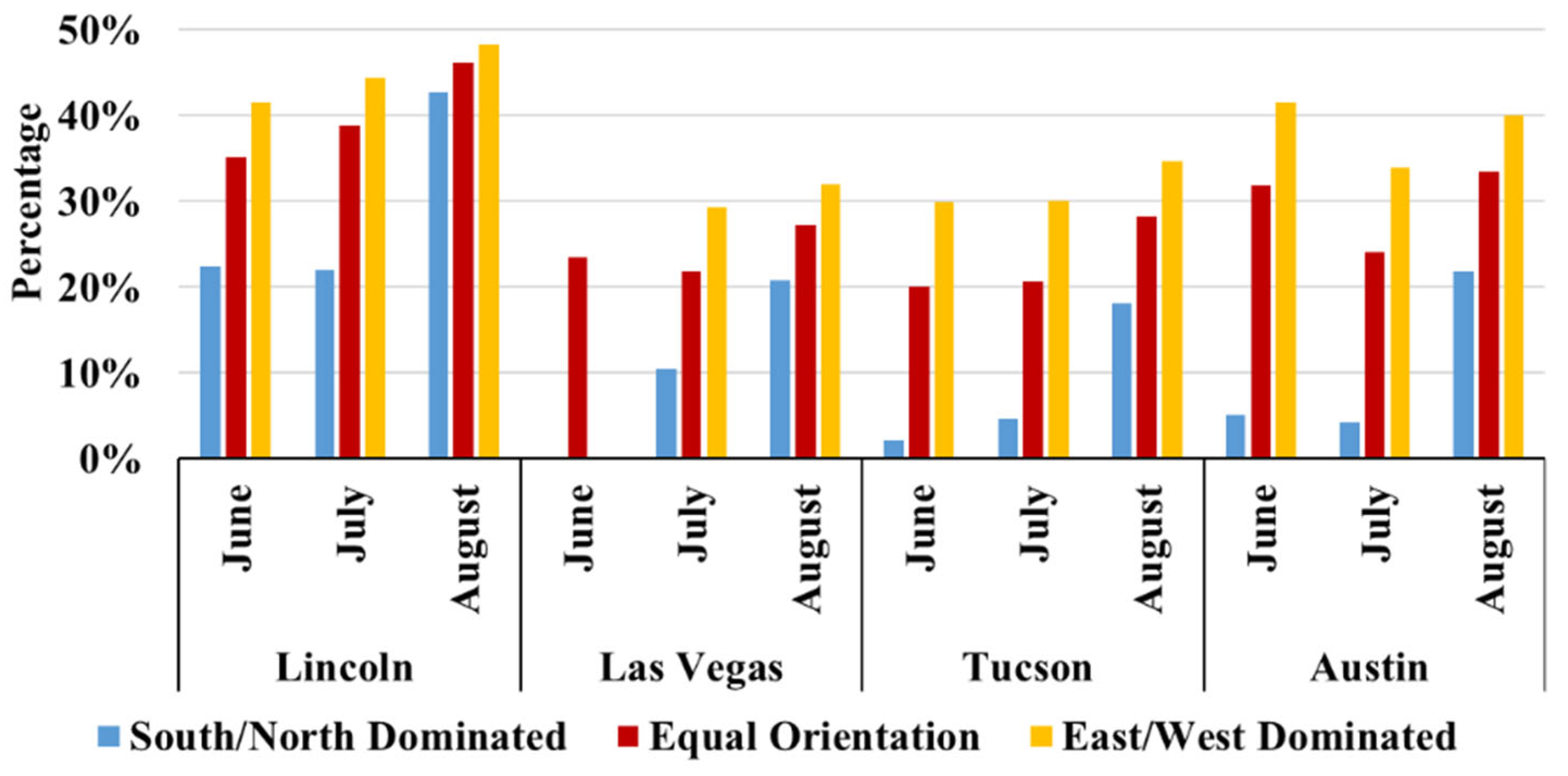 For the comparative peak-load assessment, cooling loads were considered in three different scenarios of building orientation: (1) East/West dominant (contribution 100:1 ratio), (2) Equal, and (3) South/North dominant (contribution 100:1 ratio) (more in Section 3.4).