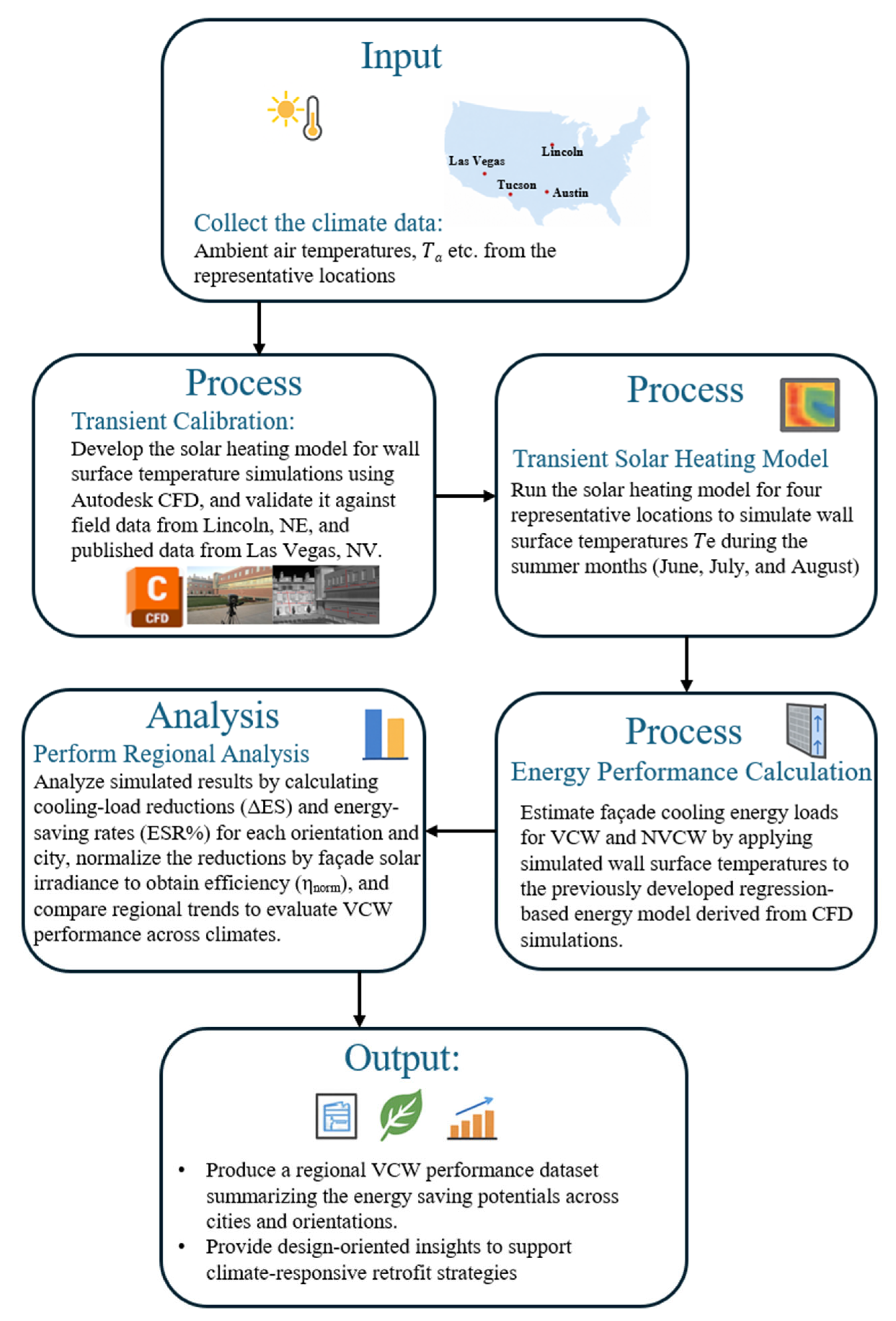 The methodology taken in the proposed work involves simulating the external wall surface temperatures of VCWs in summer climatic conditions, applying a previously validated regression-based energy model, and performing a comprehensive analytical assessment of the resulting energy performance. This combined strategy enables the estimation of overall energy saving in addition to its primary significance in terms of peak-load reduction in different climatic regions in the United States. The overall research workflow, which integrates the simulation models, energy performance calculations, and the advanced peak-load assessment for the combined study, is presented in the conceptual framework shown in Figure 4.