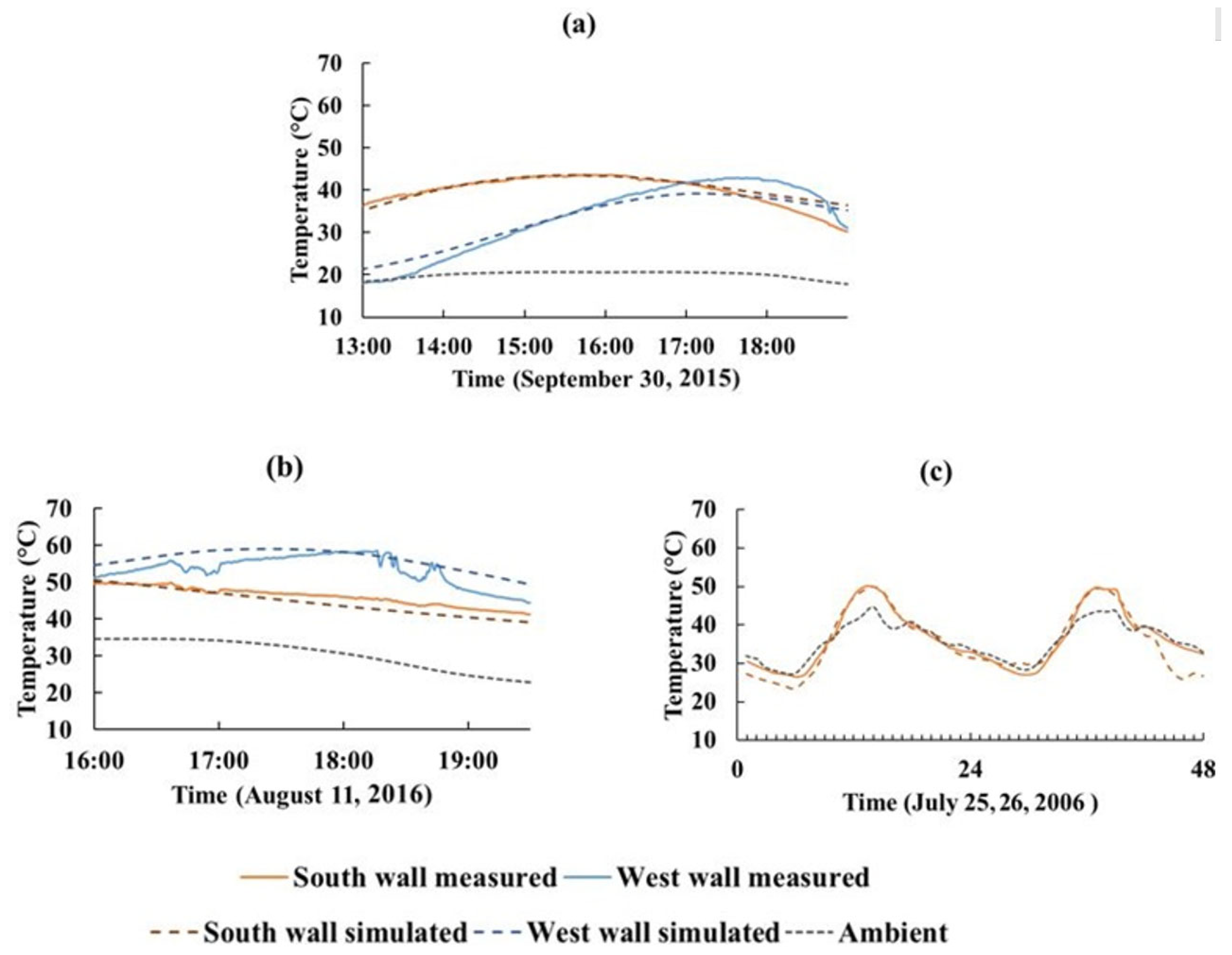 Comparison of the simulated and measured wall temperatures in (a) a fall day in Lincoln, (b) a summer day in Lincoln, (c) two summer days in Las Vegas [55,56]. The agreement between the curves demonstrates the model’s reliability in predicting surface-temperature variation.