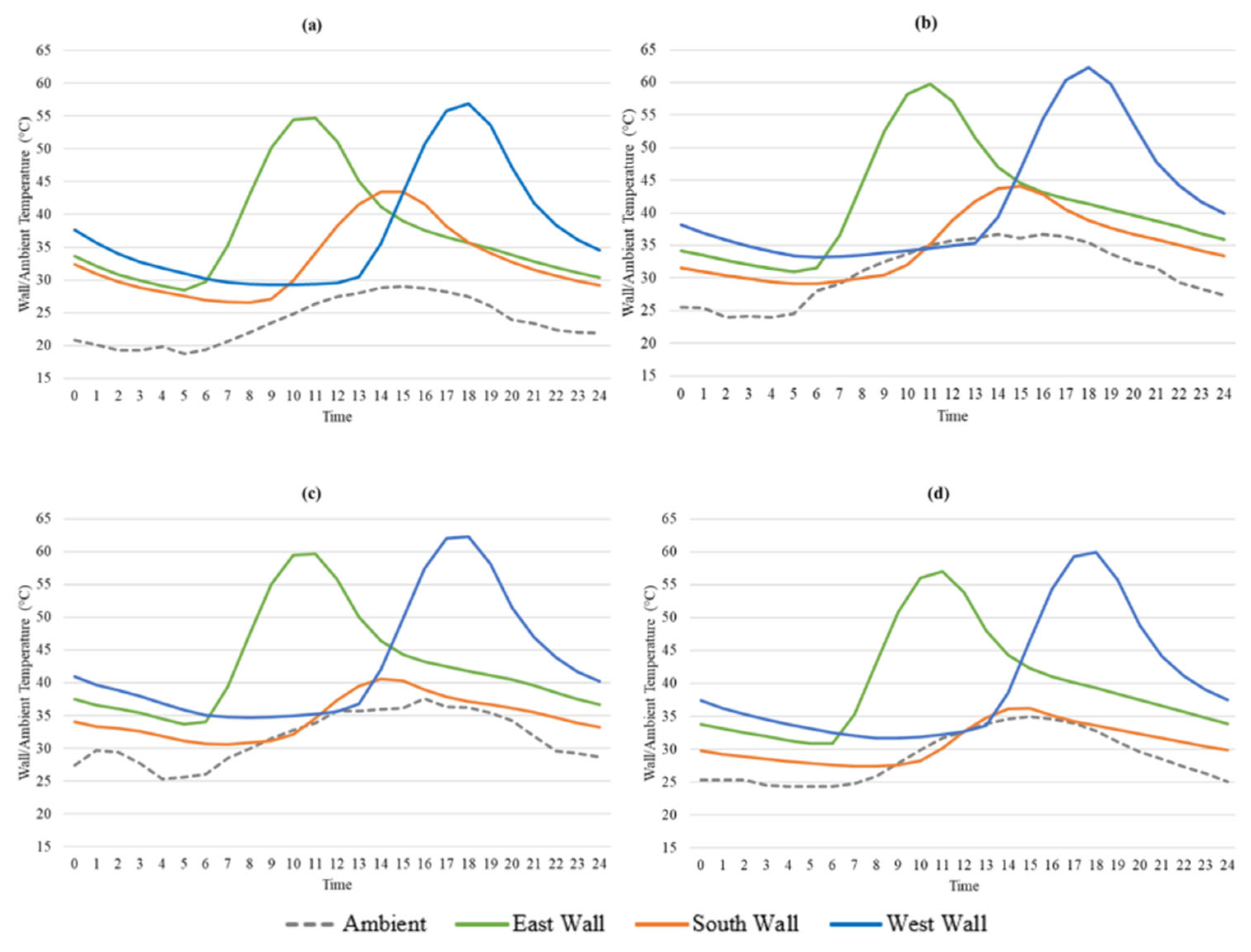 The numerical model was validated by comparing simulated wall surface temperatures with measured data from two independent experimental studies. As shown in Figure 7, good agreement was observed for both locations and orientations, with minor deviations attributable to unmodeled environmental effects (e.g., clouds, wind, shading, and ground radiation).