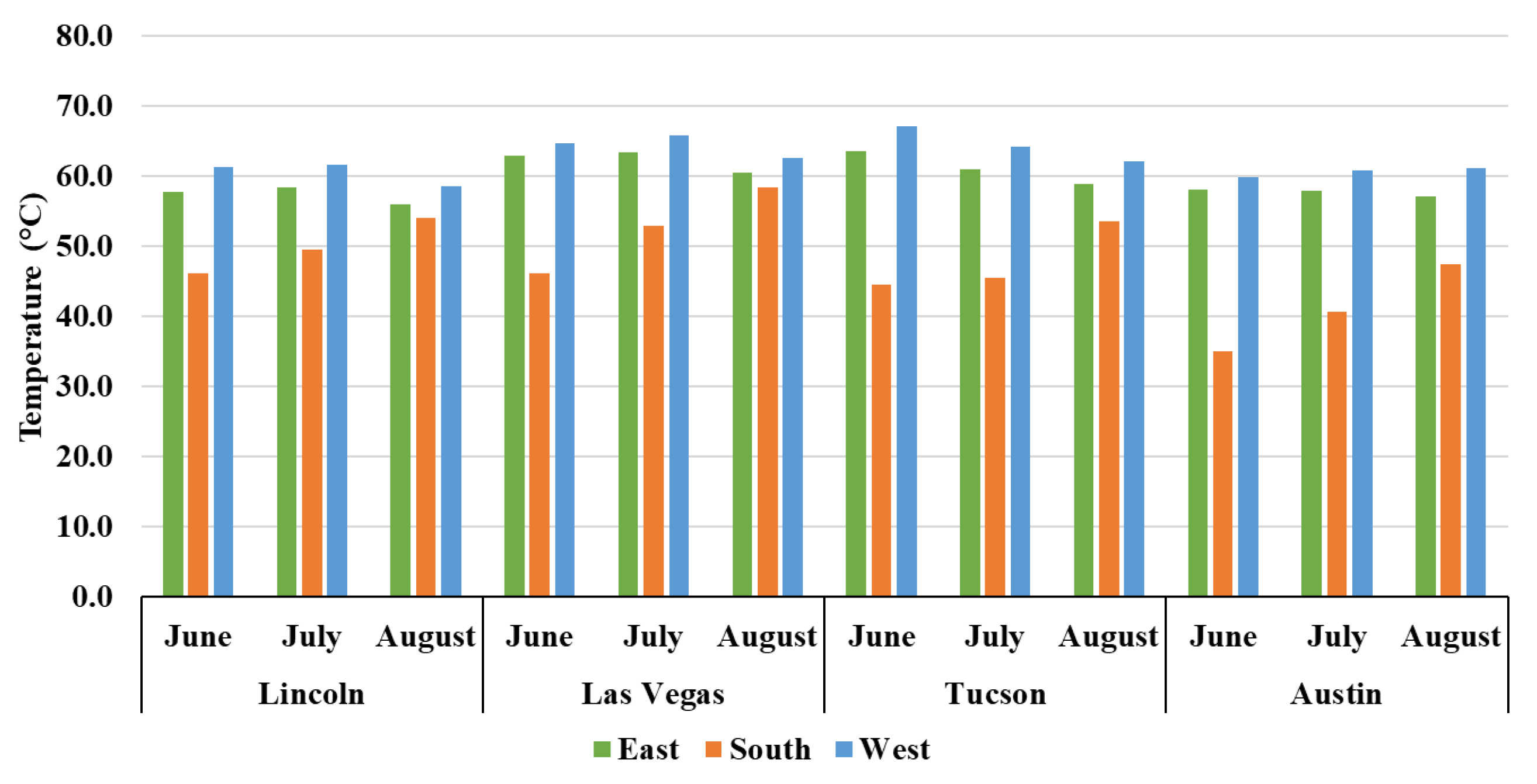 To supply region-specific surface temperatures, this study developed a transient 3D solar heating model (Figure 6) to generate hourly façade temperatures across representative U.S. climates. The resulting temperature profiles were used as inputs to estimate cooling load reductions based on the previously derived regression equations.