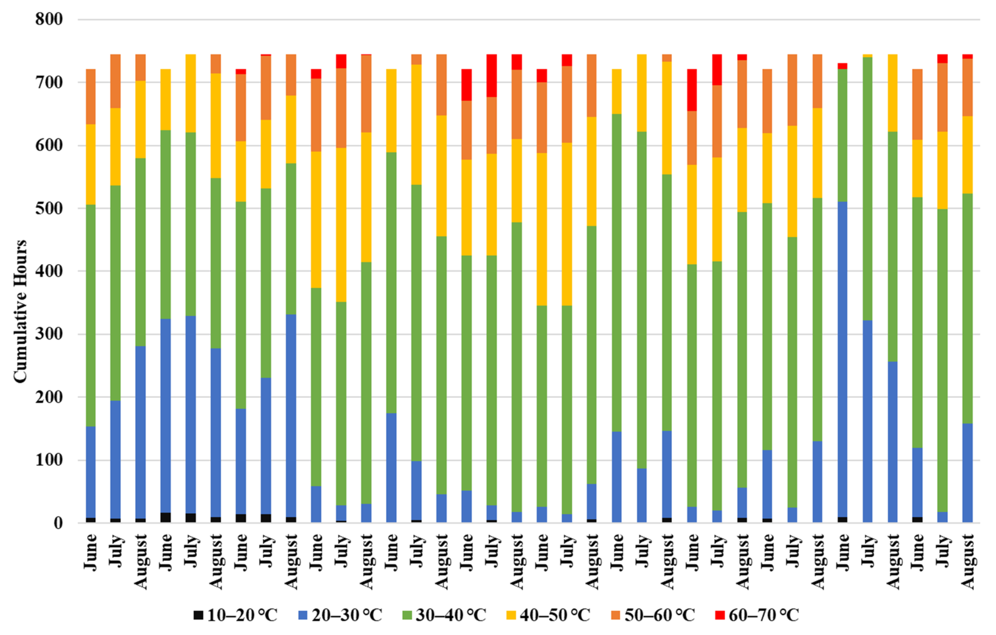 Monthly distribution of wall surface temperature durations (June–August 2016) for east, south, and west orientations across four U.S. cities. Each stacked bar represents the cumulative number of hours within 10 °C intervals.